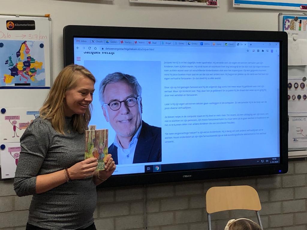 Vanwege de Corona pandemie is er gekozen om een filmpje van de auteur te laten zien en op deze manier toch te kunnen voorlezen! De juf begeleidt dit moderne voorlezen!