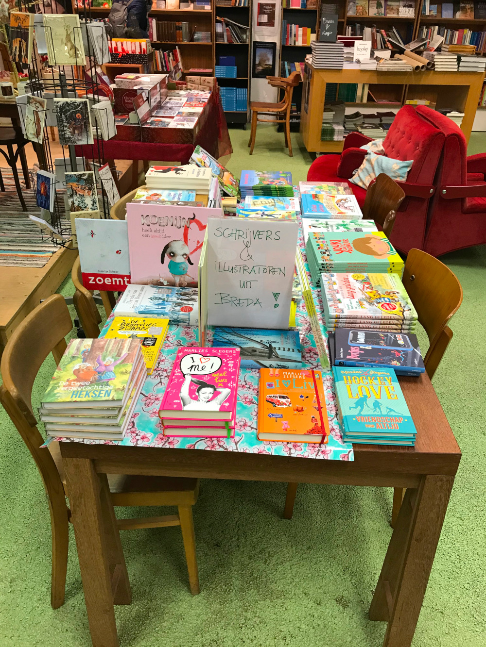 Boekhandel van Kemenade-Hollaers heeft een speciale inkijk- en leestafel achterin de boekhandel opgesteld van schrijvers en illustratoren die uit Breda komen. Een leuk initiatief van René Hollaers. Ook het boek van de Twee Vergeetachtige Heksen kon niet ontbreken! De onderstaande foto’s illustreren heel goed dat er heel vele schrijvers- en tekentalent is in Breda. U bent van harte welkom (altijd) om eens een kijkje te nemen naar deze bijzonder samengestelde tafel. Van Kemenade-Hollaers organiseert vaker “thematafels”.